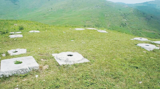 汤王行宫不远处的山坡下,就是析城山的汤帝庙,如今入眼的,仅剩残垣断壁。依稀能够看出,该庙为进深二进院落,正南为大门,向内侧为双层楼房。如今庙门已用石头围挡,出于安全考虑,不再允许游人进入。记者一行人绕着汤庙外围墙走了一圈,走到西侧围墙时,无意中发现围墙的大青石上似乎有字。记者走到跟前,用手蘸了点周围野草上的露水,在围墙上涂抹了一下,青石上的字迹立刻显露出来。再摸了摸其他的石砖,好像都有字,整面墙几乎都是用刻有文字的青石砌成。由于年代久远,字迹斑驳,也看不清楚刻的是什么字,看来这还需要有关专业人士去研究。